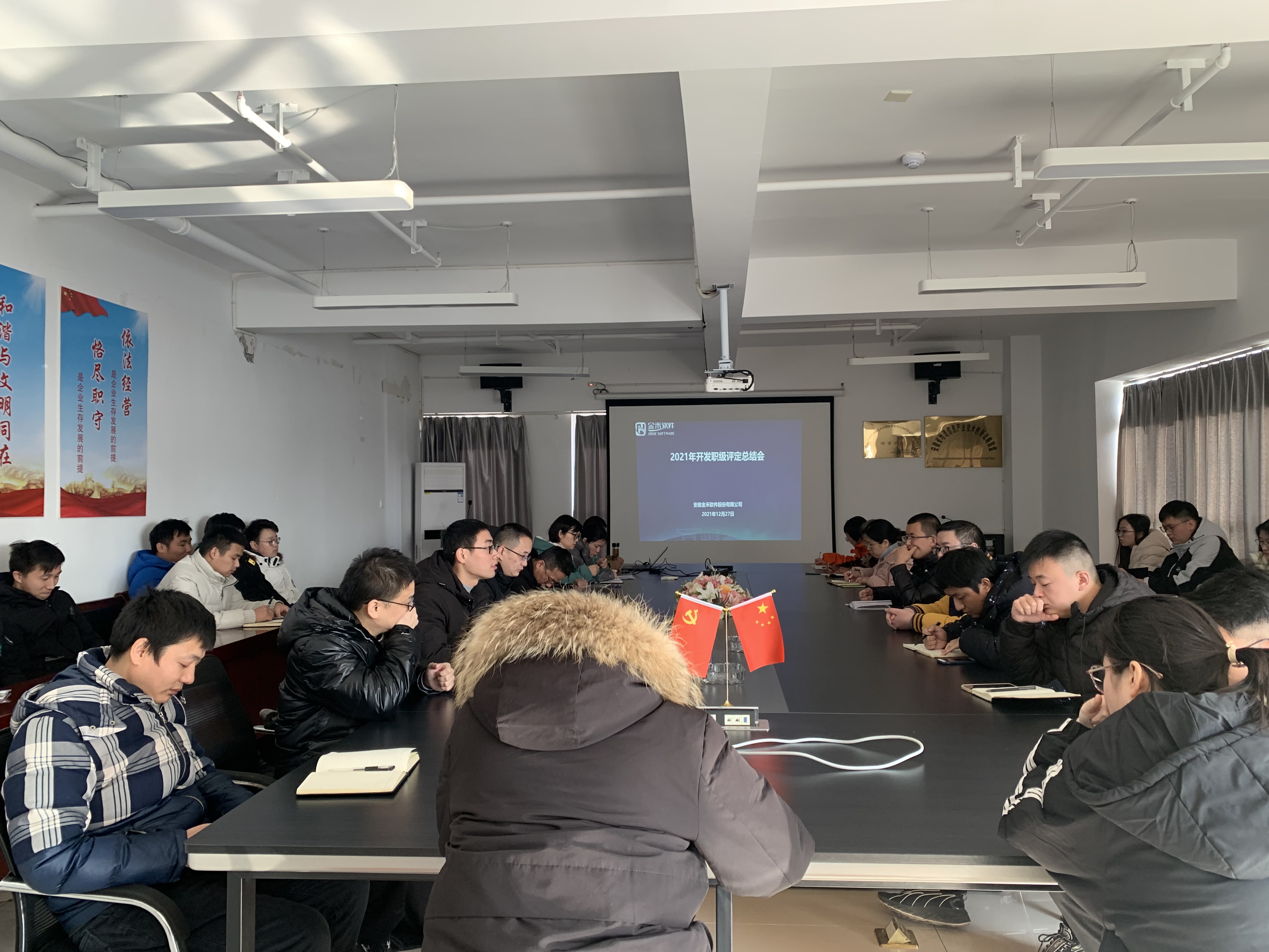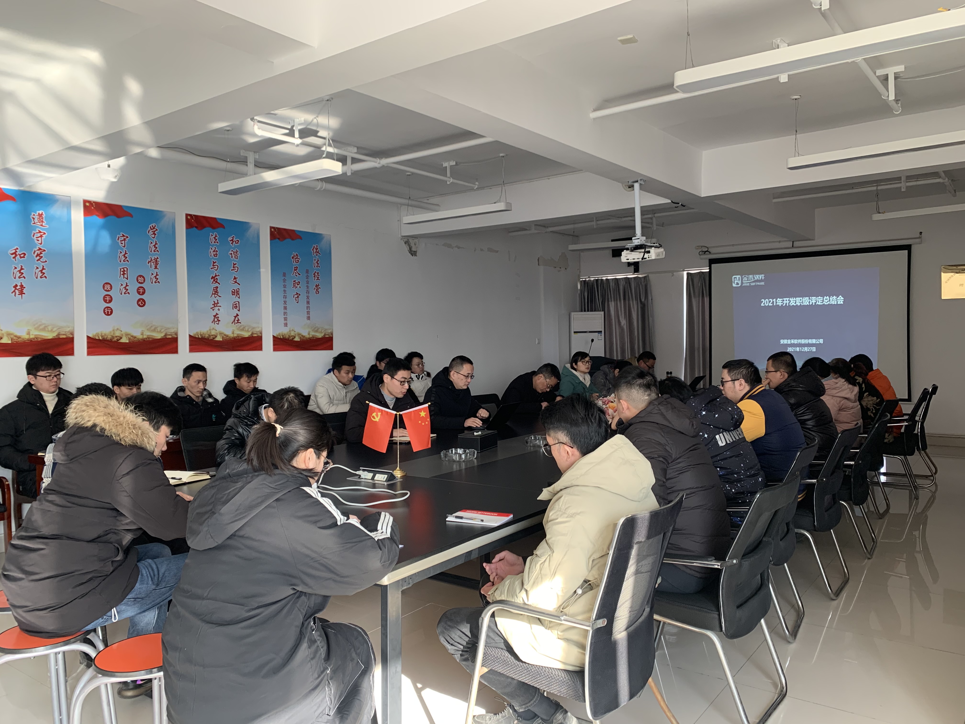 2021年12月27日下午,金禾软件组织召开2021年开发职级评定总结会,全面总结2021年开发人员的职业技能等级评定工作,同时安排部署关于2022年的等级评定工作及开发人员人才技能提升、培养计划,为公司的高质量发展提供技能人才支撑。金禾软件领导、相关部门负责人及相关工作人员参加了本次会议。