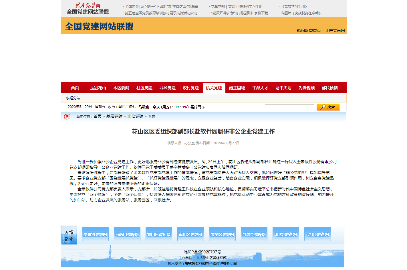 为进一步加强非公企业党建工作,更好地服务非公有制经济健康发展。5月24日上午,花山区委组织部副部长屈晓红一行深入金禾软件股份有限公司党支部调研指导非公企业党建工作。软件园党工委委员王蕾率管委会非公党建负责同志陪同调研。