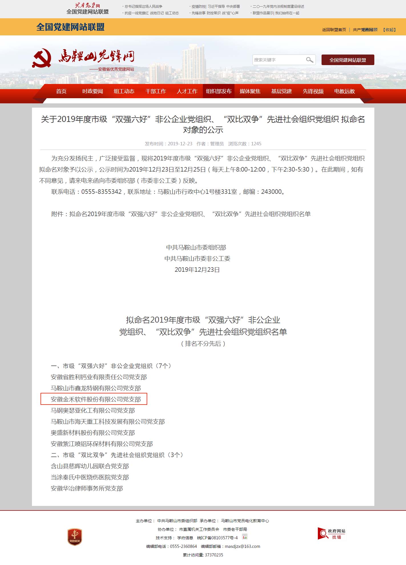 金禾软件党支部荣获2019年度市级“双强六好”非公企业党组织称号