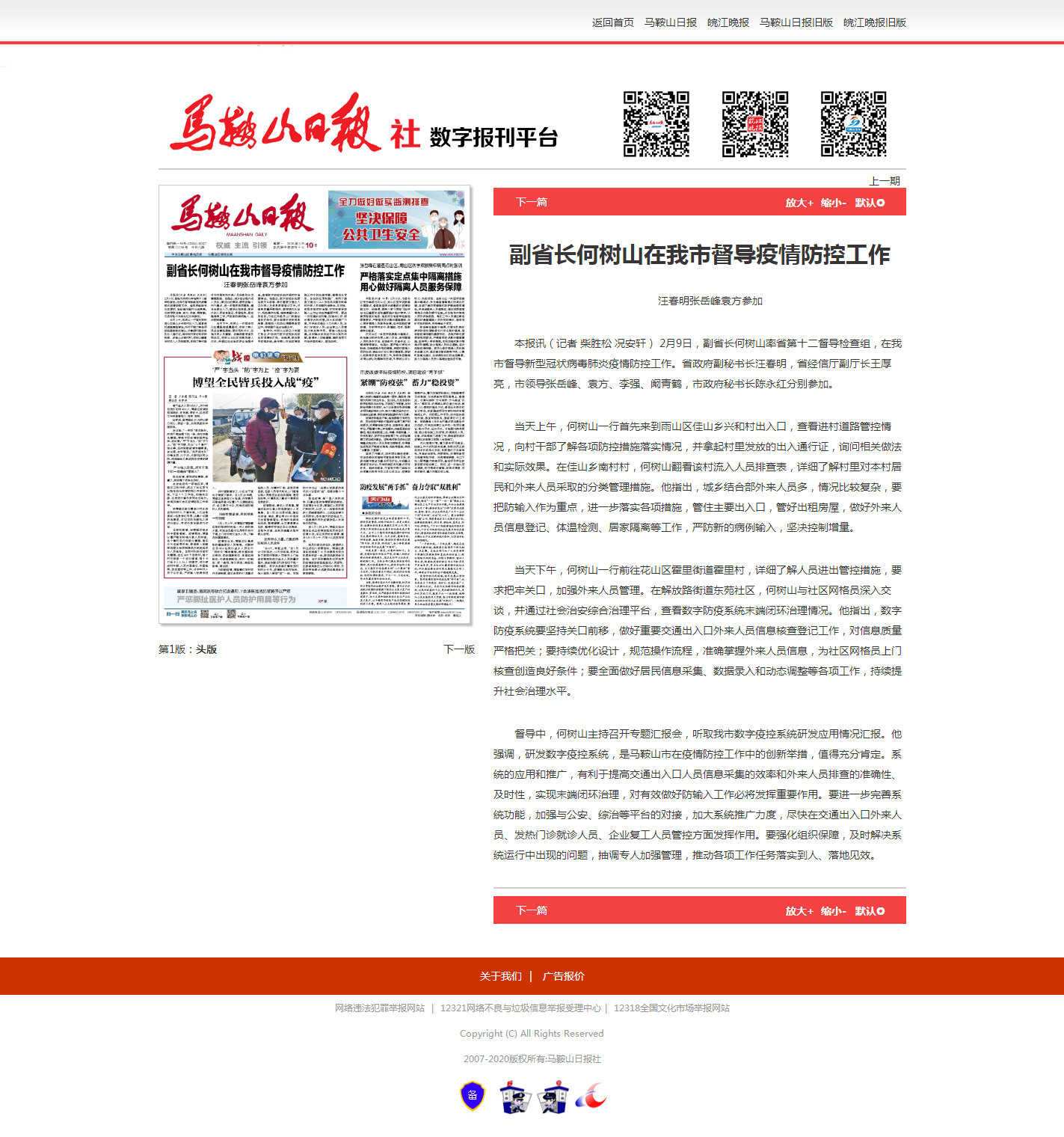 督导中,何树山主持召开专题汇报会,听取我市数字疫控系统研发应用情况汇报。他强调,研发数字疫控系统,是马鞍山市在疫情防控工作中的创新举措,值得充分肯定。系统的应用和推广,有利于提高交通出入口人员信息采集的效率和外来人员排查的准确性、及时性,实现末端闭环治理,对有效做好防输入工作必将发挥重要作用。要进-步完善系统功能,加强与公安、综治等平台的对接,加大系统推广力度,尽快在交通出入口外来人员、发热门诊就诊人员、企业复工人员管控方面发挥作用。要强化组织保障,及时解决系统运行中出现的问题,抽调专人加强管理,推动各项工作任务落实到人、落地见效。