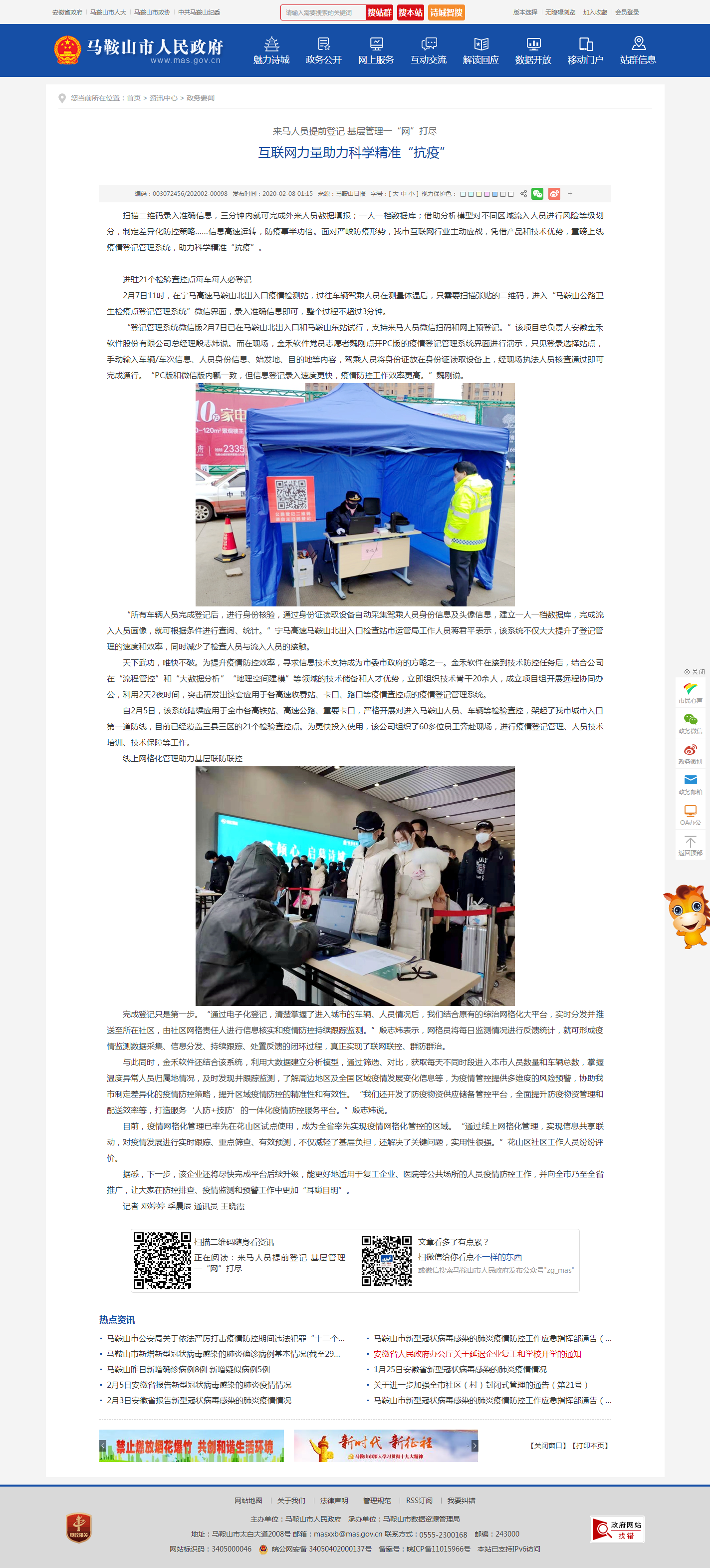 2月7日11时,在宁马高速马鞍山北出入口疫情检测站,过往车辆驾乘人员在测量体温后,只需要扫描张贴的二维码,进入“马鞍山公路卫生检疫点登记管理系统”微信界面,录入准确信息即可,整个过程不超过3分钟。