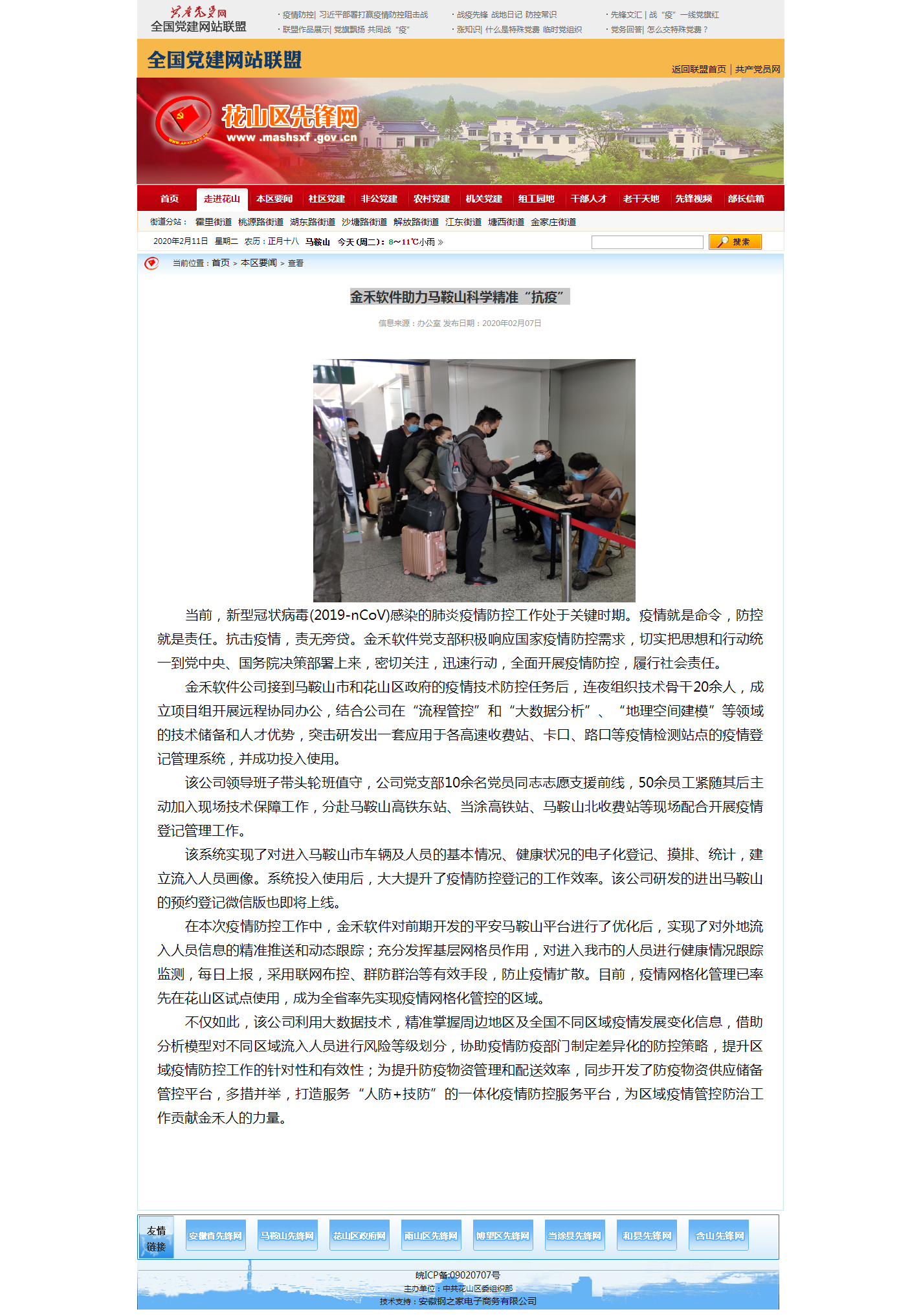 金禾软件公司接到马鞍山市和花山区政府的疫情技术防控任务后,连夜组织技术骨干20余人,成立项目组开展远程协同办公,结合公司在“流程管控”和“大数据分析”、“地理空间建模”等领域的技术储备和人才优势,突击研发出一套应用于各高速收费站、卡口、路口等疫情检测站点的疫情登记管理系统,并成功投入使用。