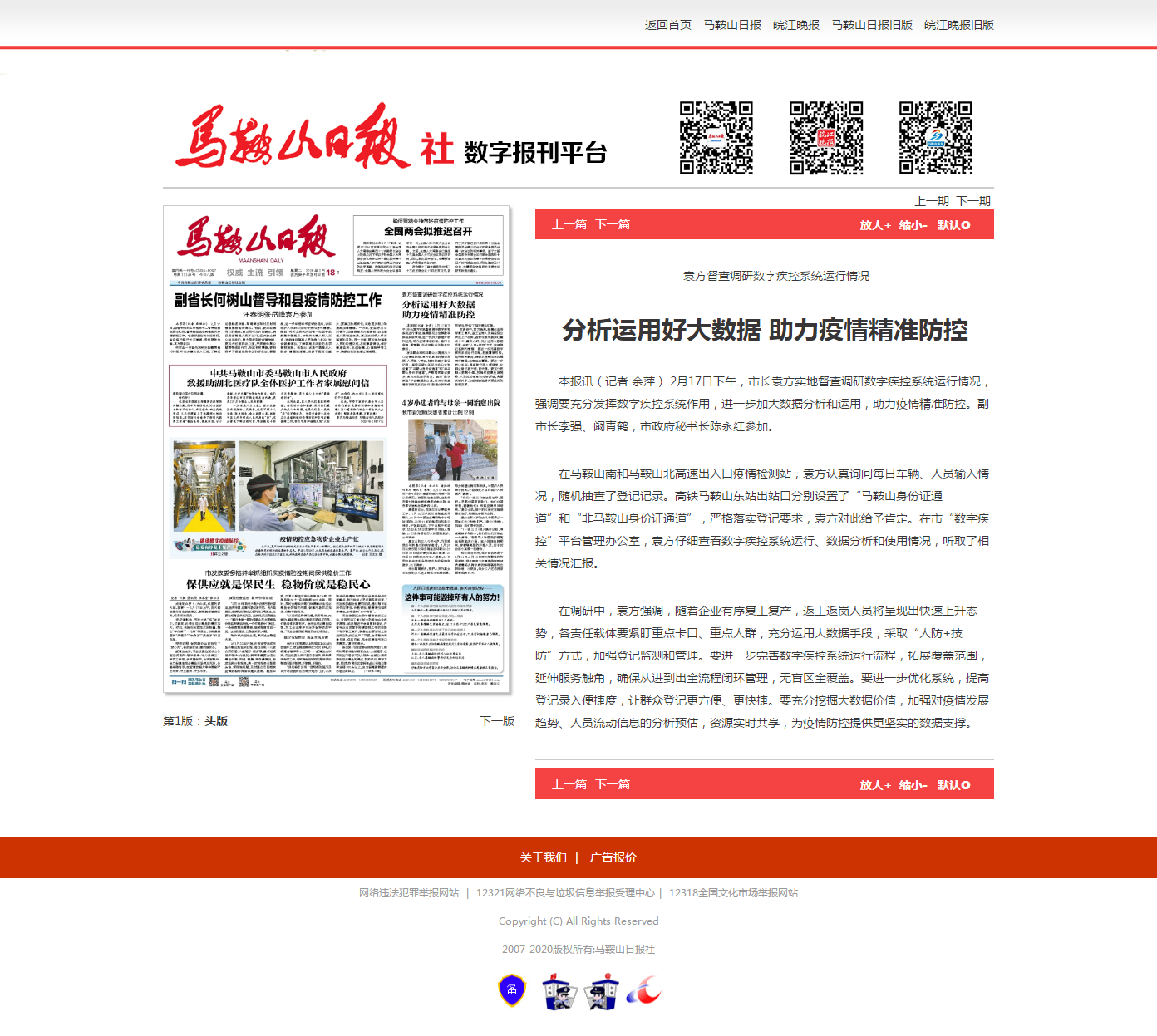 在调研中,袁方强调,随着企业有序复工复产,返工返岗人员将呈现出快速上升态势,各责任载体要紧盯重点卡口、重点人群,充分运用大数据手段,采取“人防+技防”方式,加强登记监测和管理。要进一步完善数字疾控系统运行流程,拓展覆盖范围,延伸服务触角,确保从进到出全流程闭环管理,无宜区全覆盖。要进一步优化系统,提高登记录入便捷度,让群众登记更方便、更快捷。要充分挖掘大数据价值,加强对疫情发展趋势、人员流动信息的分析预估,资源实时共享,为疫情防控提供更坚实的数据支撑。(来源:马鞍山日报)