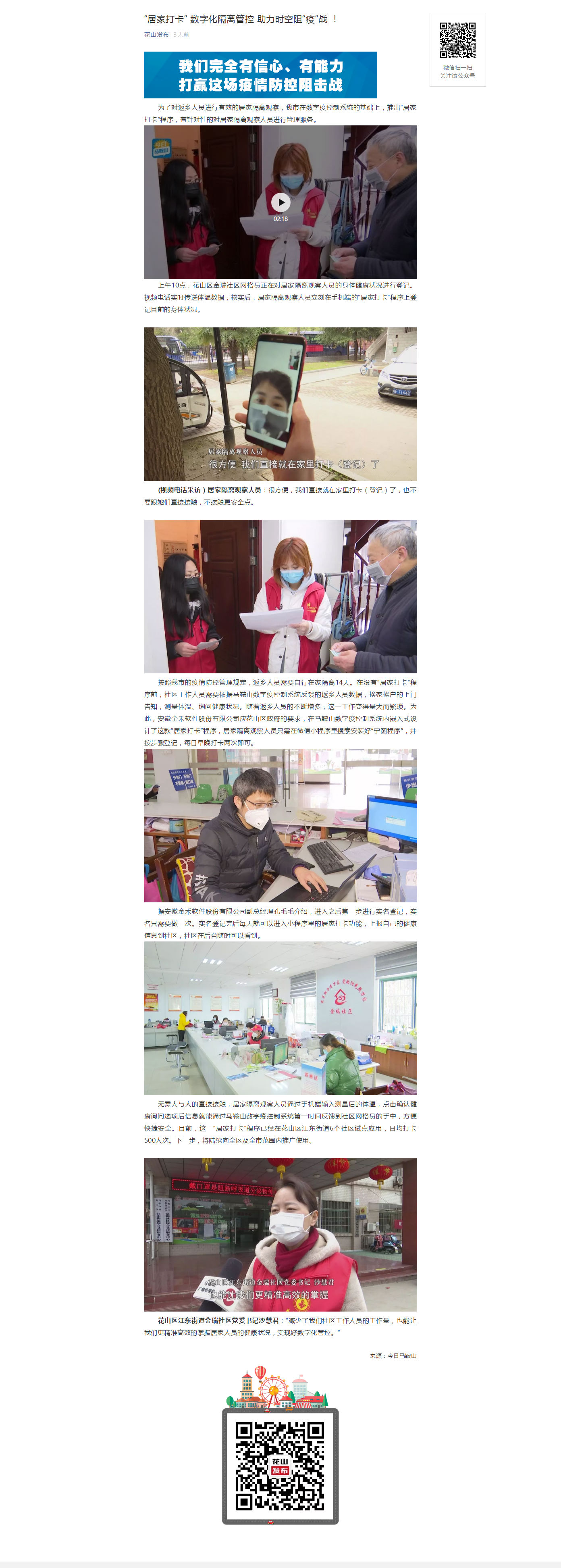 无需人与人的直接接触,居家隔离观察人员通过手机端输入测量后的体温,点击确认健康询问选项后信息就能通过马鞍山数字疫控系统第一时间反馈到社区网格员的手中,方便快捷安全。目前,这一“居家打卡”程序已经在花山区江东街道6个社区试点应用,日均打卡500人次。下一步,将陆续向全区及全市范围内推广使用。