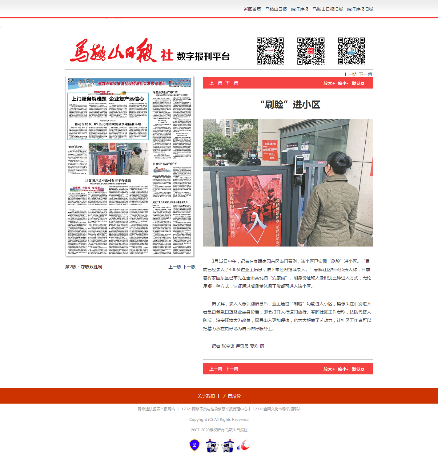 3月12日中午,记者在春晖家园东区南门看到,该小区已实现“刷脸”进小区。“目前已经录入了400多位业主信息,接下来还将继续录入。”春晖社区相关负责人称,目前春晖家园东区已率先在全市实现扫“安康码”、刷身份证和人像识别三种进入方式,无论用哪一种方式,认证通过后测量体温正常都可进入该小区。