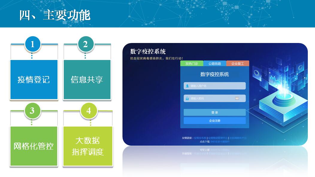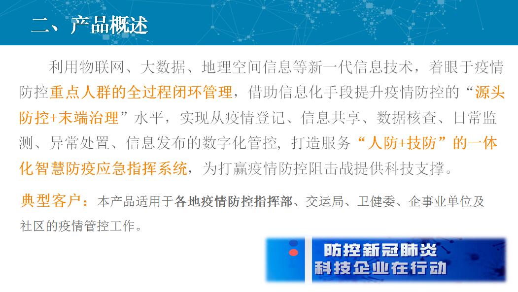数字疫控系统是利用物联网、大数据、地理空间信息等新一代信息技术,着眼于疫情防控重点人群的全过程闭环管理,借助信息化手段提升疫情防控的“源头防控+末端治理”水平,实现从疫情登记、信息共享、数据核查、日常监测、异常处置、信息发布的数字化管控, 打造服务“人防+技防”的一体化数字疫控系统,为打赢疫情防控阻击战提供科技支撑。
